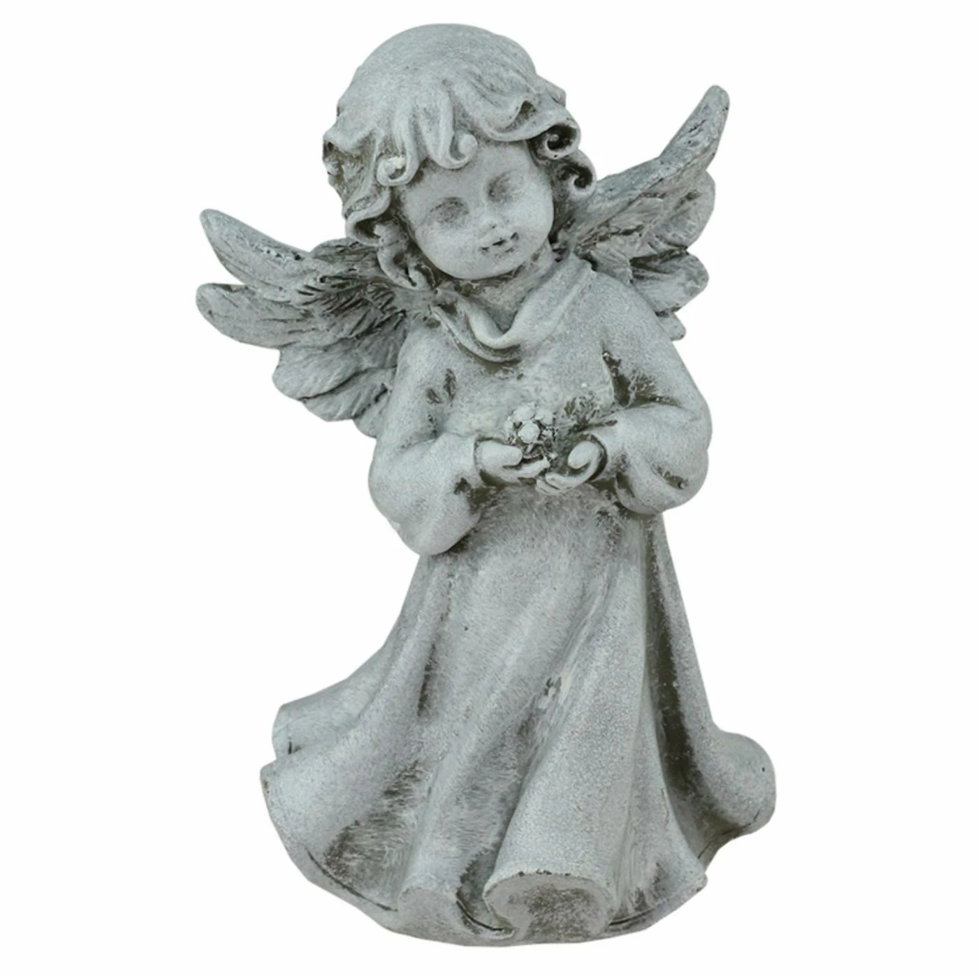 A sweet and simple style adds charm to the Northlight Heavenly Gardens Cherub Angel Girl with Flower Outdoor Garden Statue, featuring a delightful cherub girl a she holds a blooming flower in her hands. Made of durable polyresin, this indoor/outdoor statue is completed in a distressed, weathered gray finish.