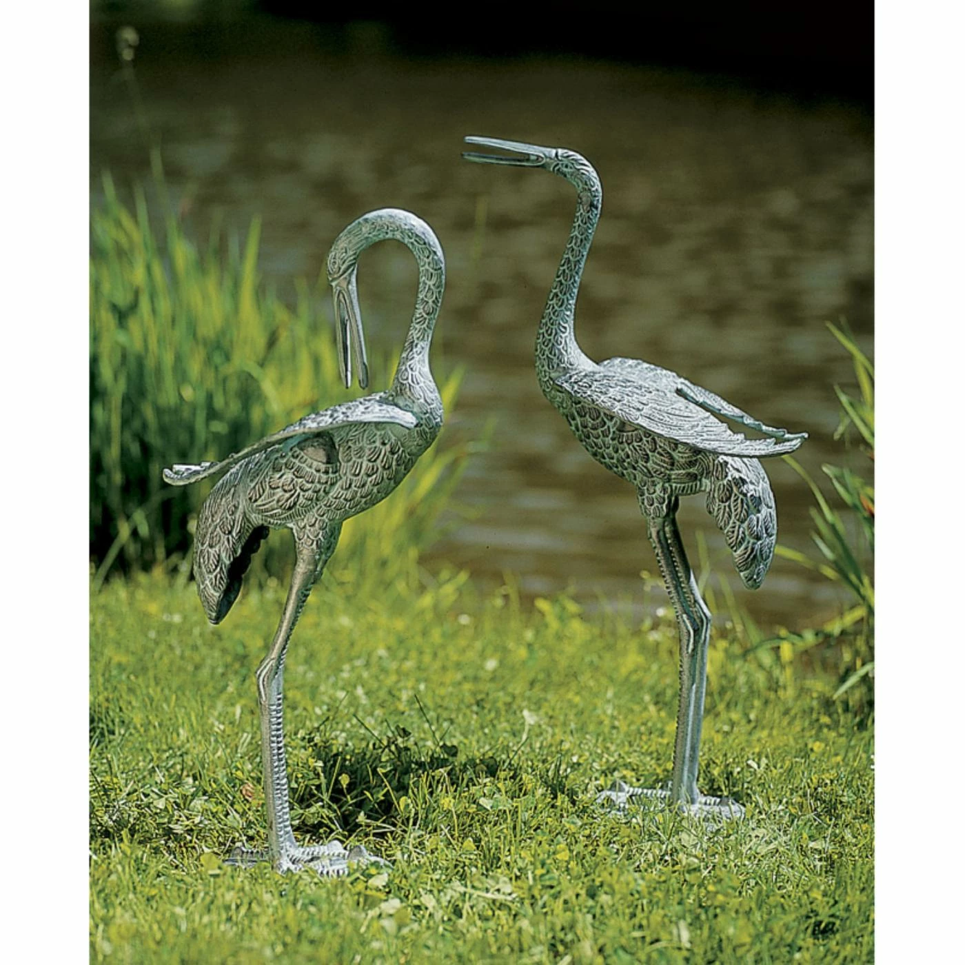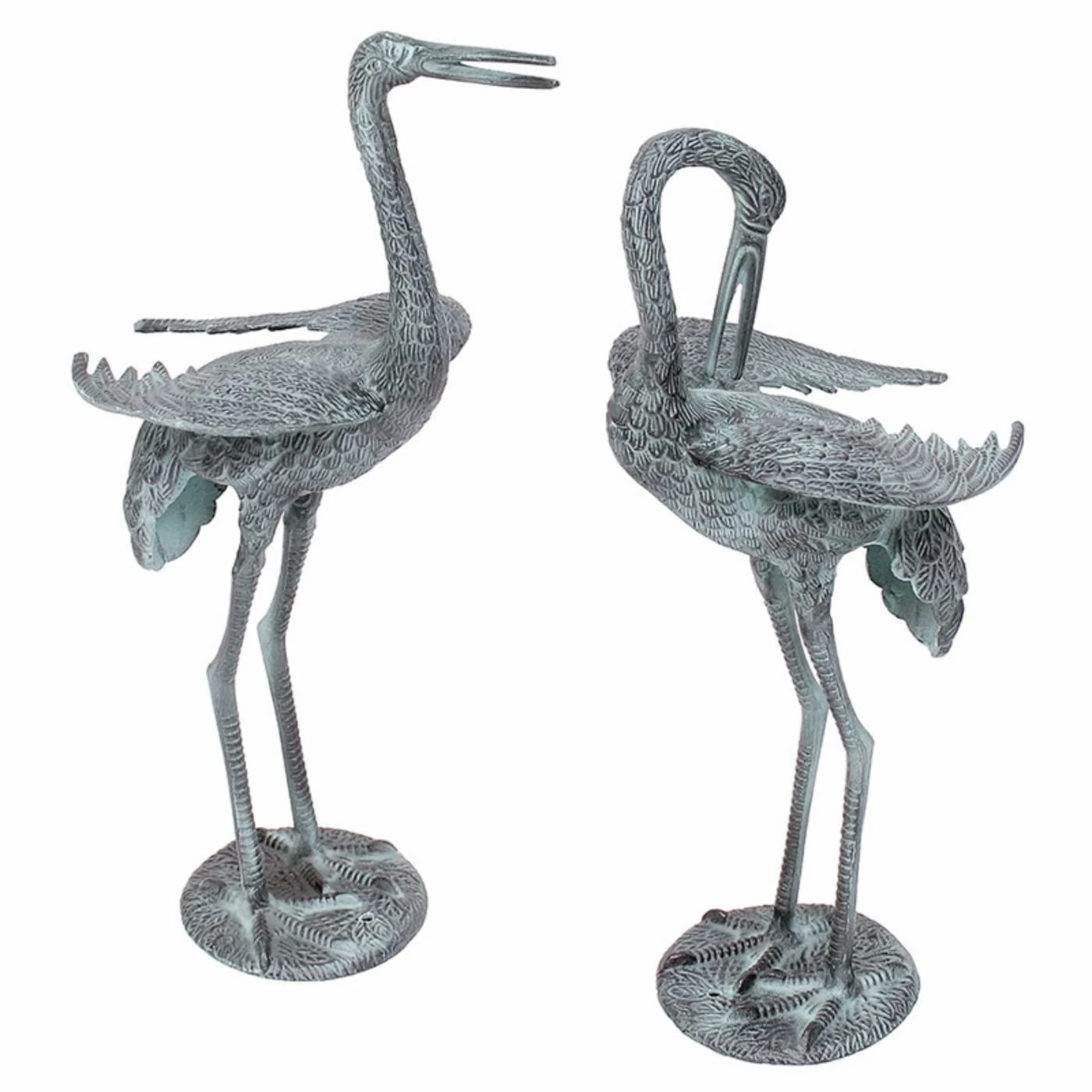 Traditionally a symbol of peace, the cranes in this Achla Designs Preening Crane Garden Statues – Set of 2 make a graceful addition to any garden or landscape. This set includes two handmade cast aluminum cranes with a painted blue-gray verdi finish. Each is approximately two feet tall and stands in its own pose.