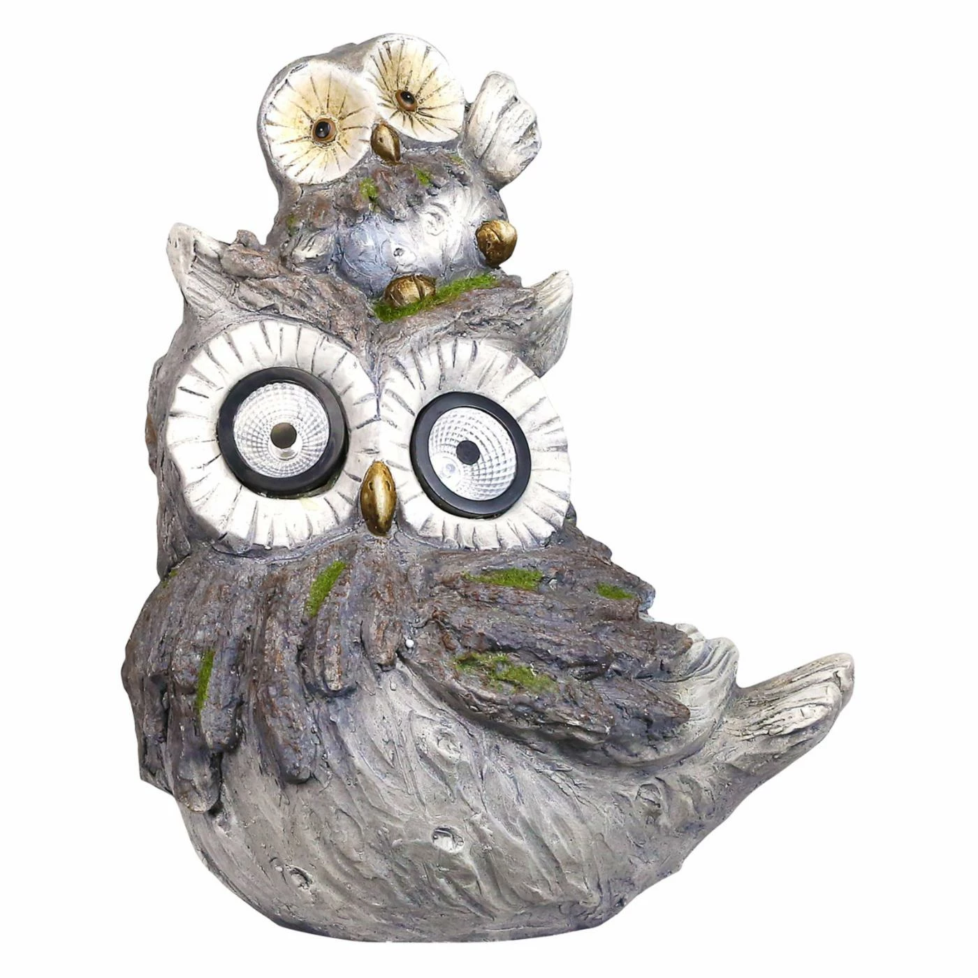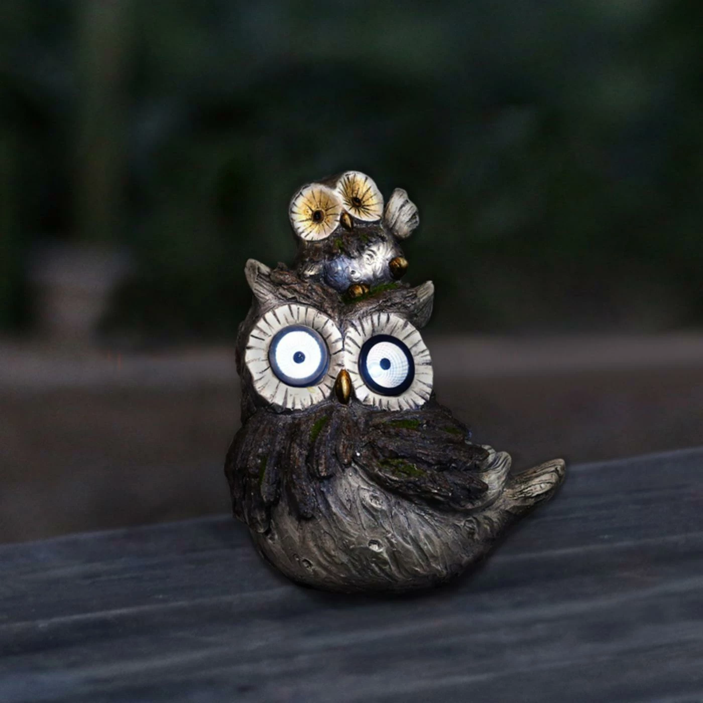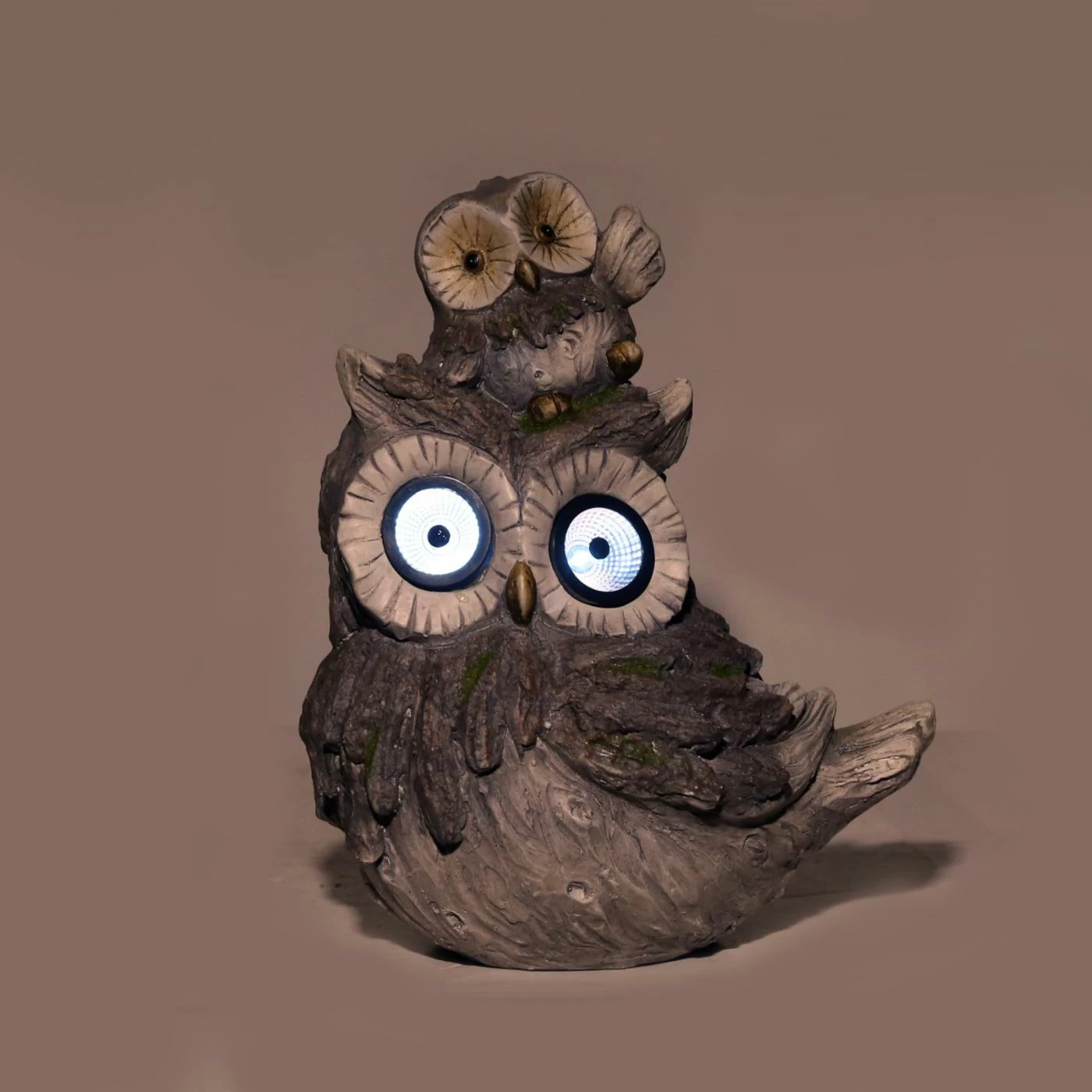 A friendly owlet and owl on the Alpine Solar Color-Changing LED Owls Garden Statue are dressed in bark texturing with lifelike moss details. The adult owl’s eyes light up with color-changing LED lights, thanks to its solar-powered daylight charge.