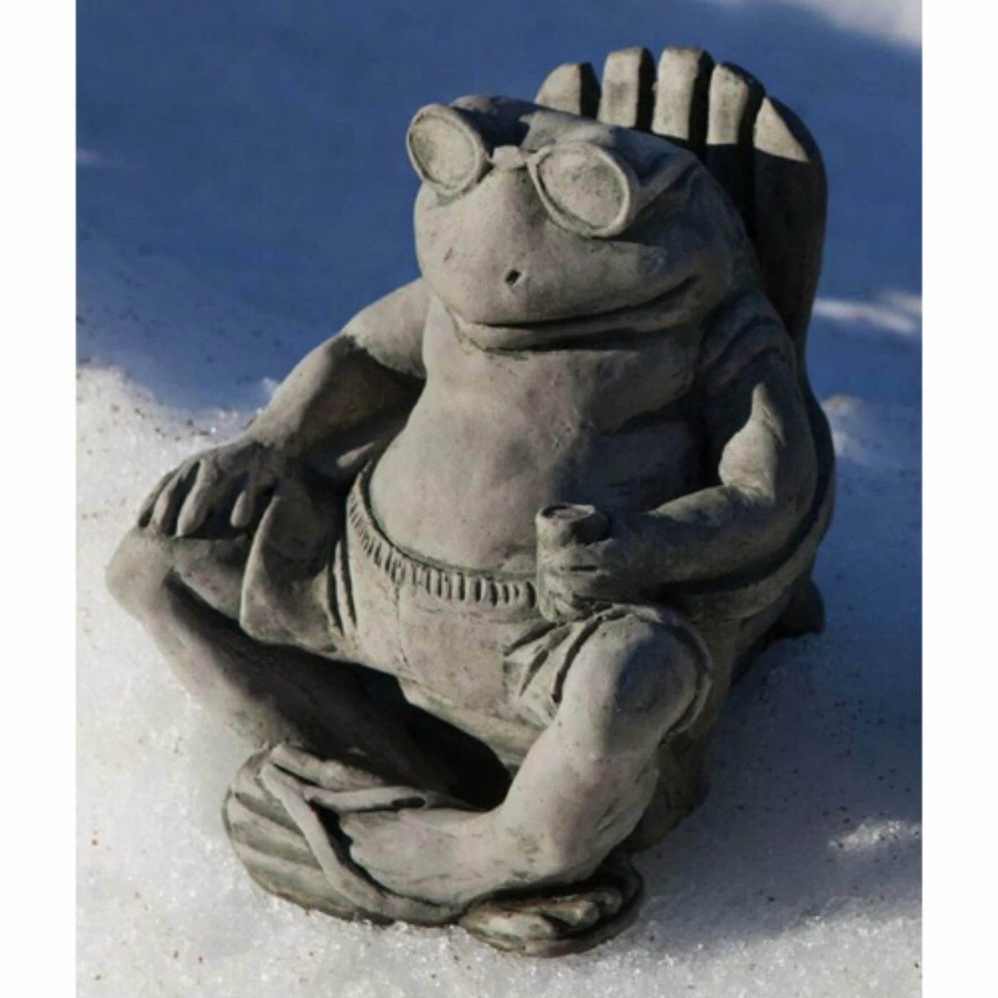 Welcome your guests in humorous style with the Campania International Bud on the Beach Garden Statue, featuring a lounging frog. A myriad of details like his flip-flops, sunglasses, lounge chair, and bathing suit makes this garden statue a fun outdoor accessory. Pick out your favorite available finish for the cast stone construction to bring him into your home.