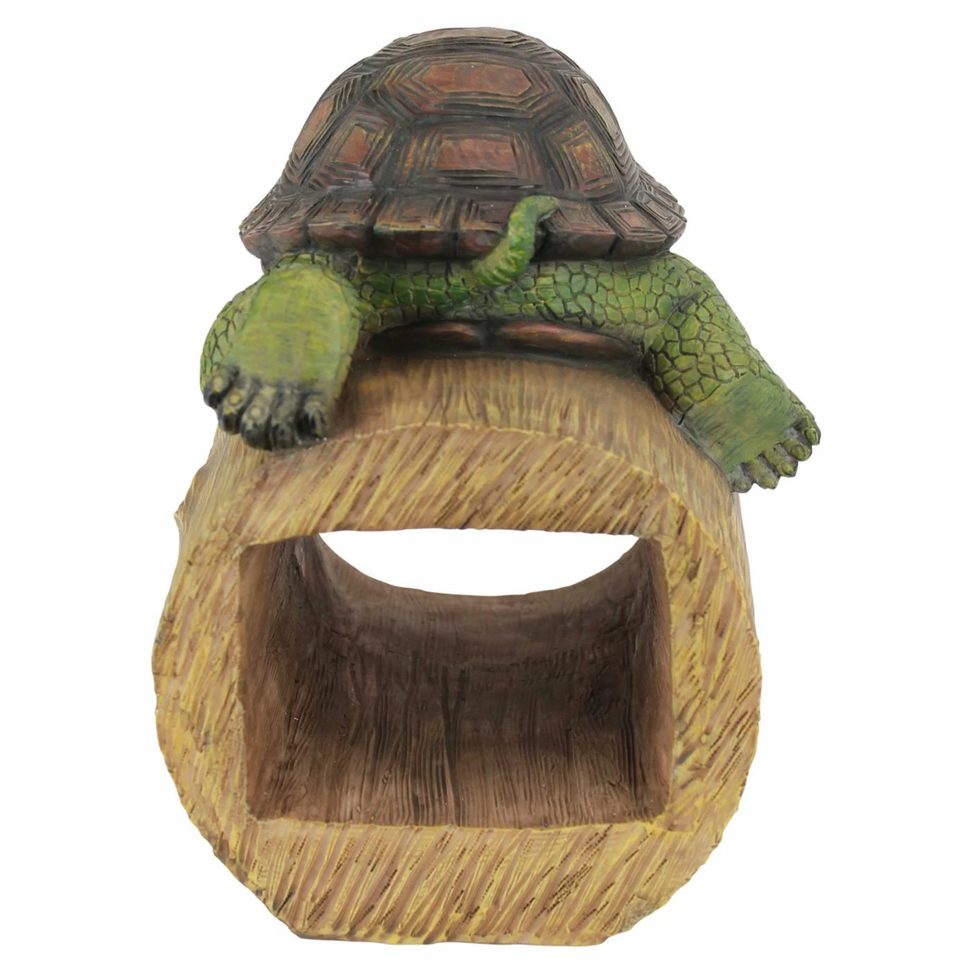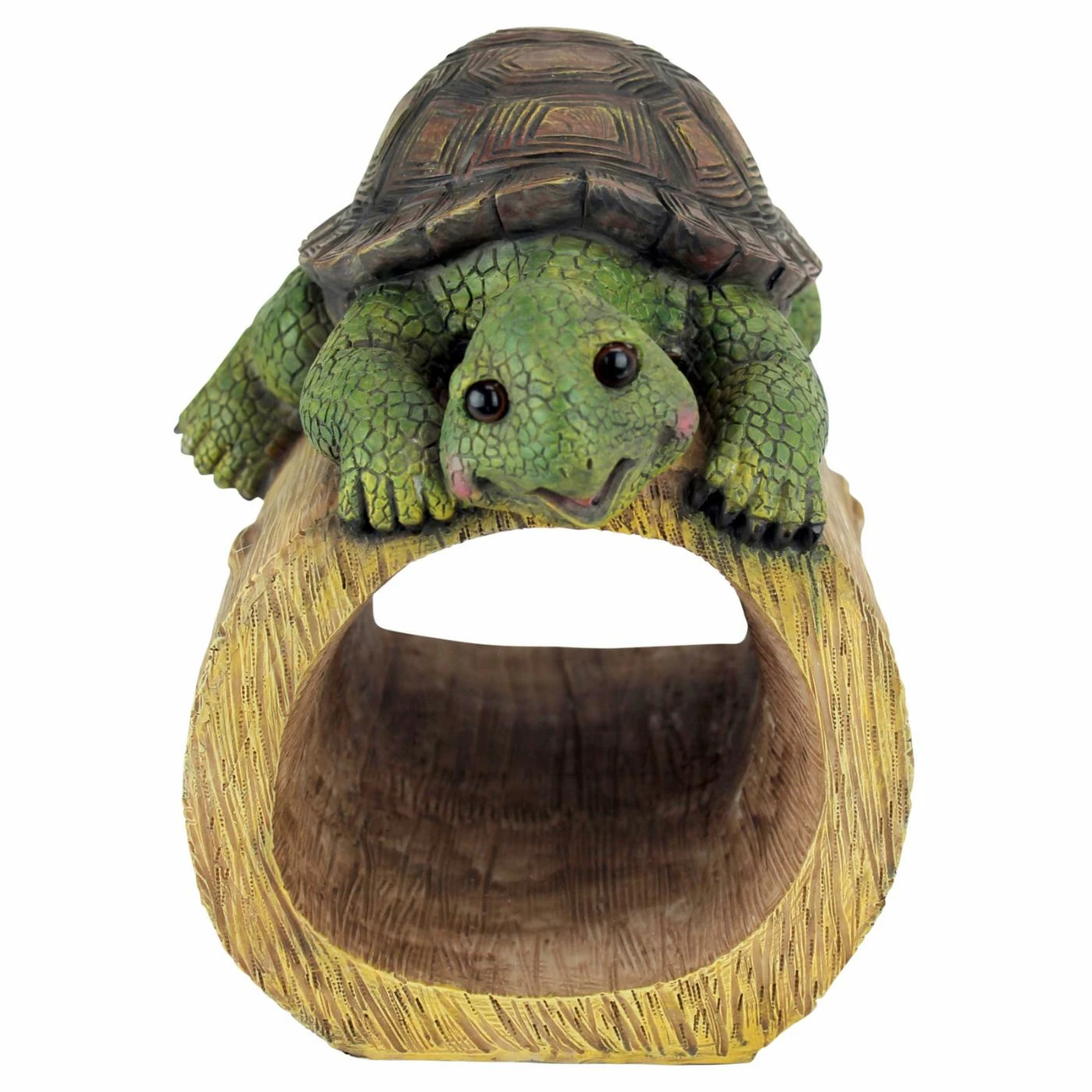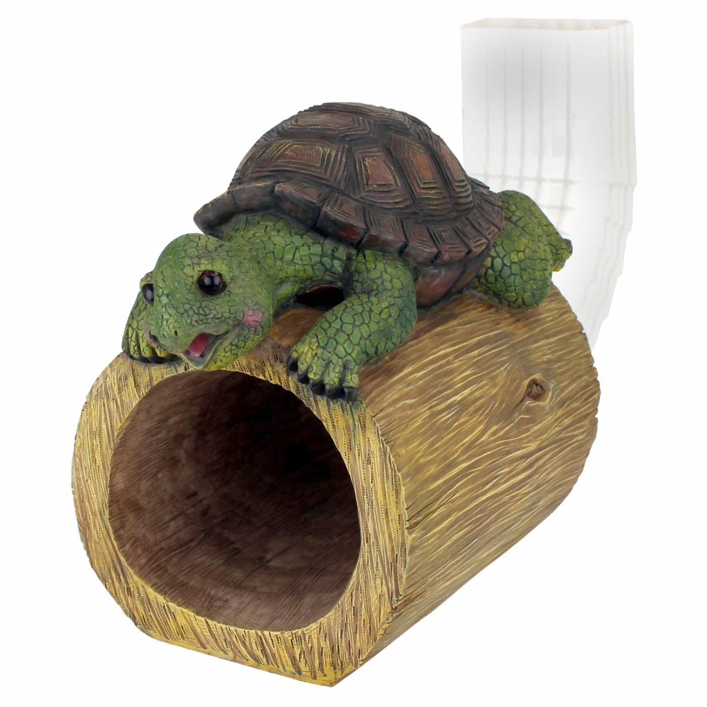 Protect your downspout while adding charm to your landscaping. The Design Toscano Drips The Turtle Gutter Guardian Downspout Garden Statue features a wide-eyed green turtle watching water flow through your gutter downspout and out onto your lawn. This turtle relaxes on a hollow log, which can accommodate a standard rectangular downspout. Cast of quality designer resin, this hand-painted statue is sure to make a big impression!