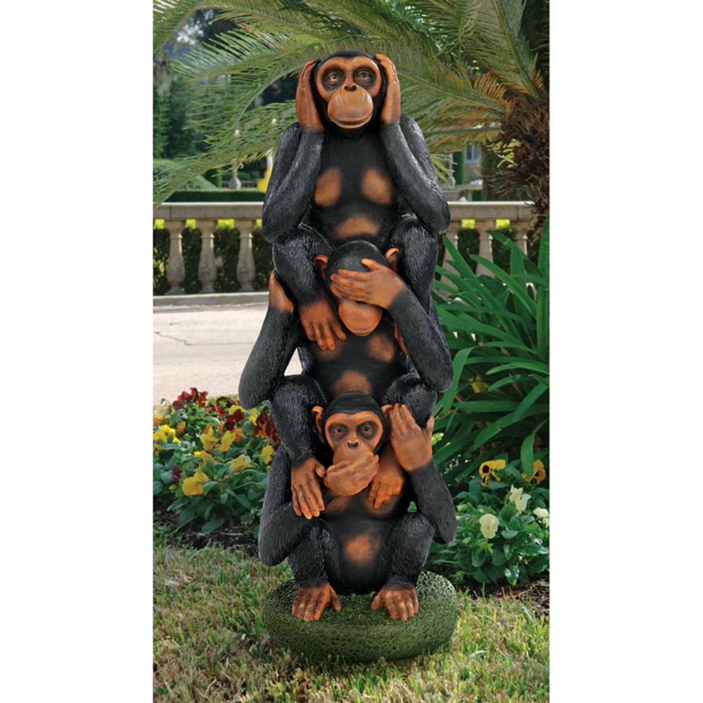 The classic Design Toscano Hear No Evil See No Evil Speak No Evil Monkeys Grand-Scale Statue will add a fun touch to any space. Quality designer resin construction makes this piece a lasting addition to your home or garden. Hand-painted in natural tones, this design is perfect for a centerpiece of style. A round base offers better stability, while the charming look is sure to be a favorite.