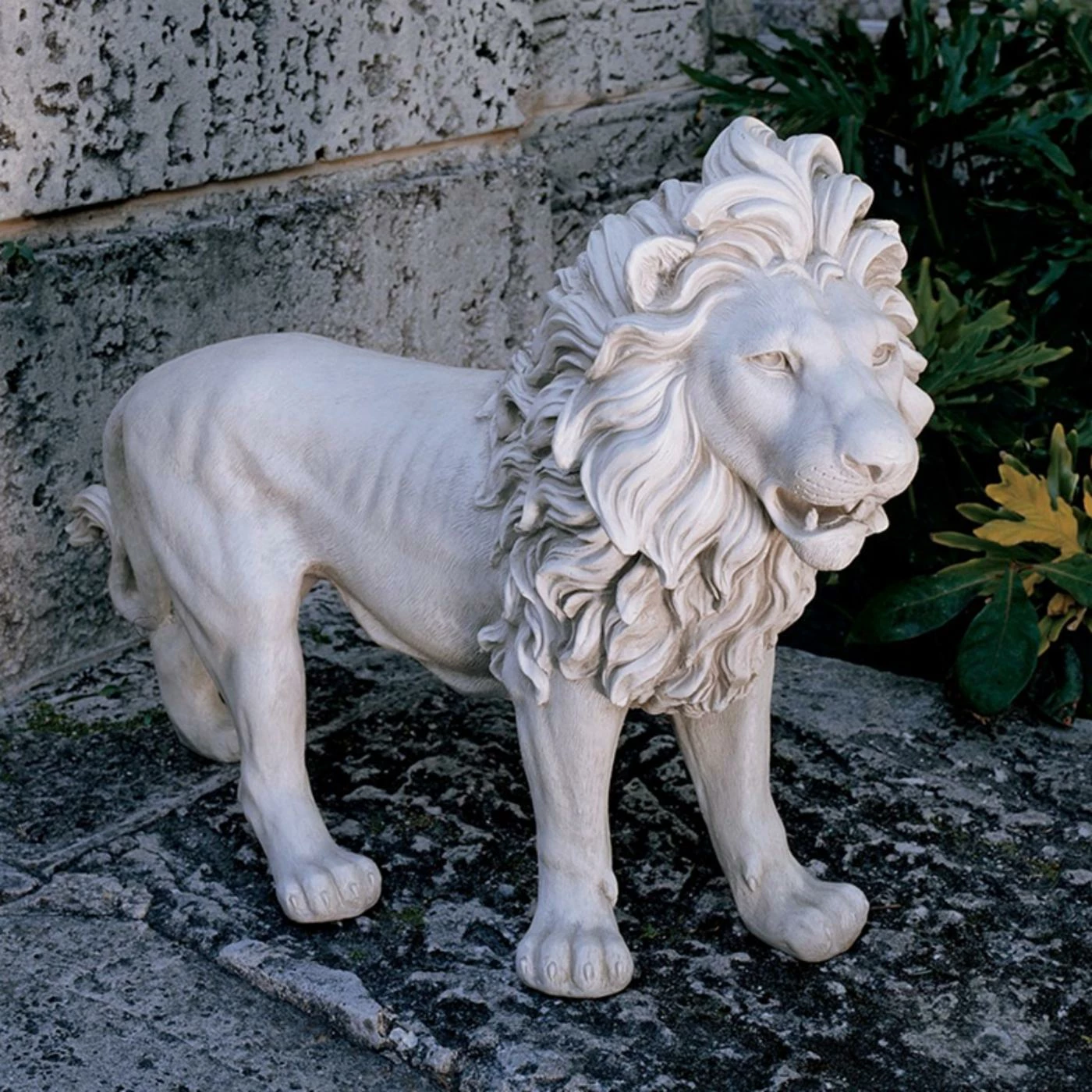 Your Design Toscano Regal Lion Sentinel of Grisham Manor Statue – Left Foot Forward guards your home and welcomes guests with a ferocious spirit. This stately lion is artfully carved from durable, art-grade resin to withstand the elements. Its realistic white faux-stone finish will have everyone convinced it’s authentic.