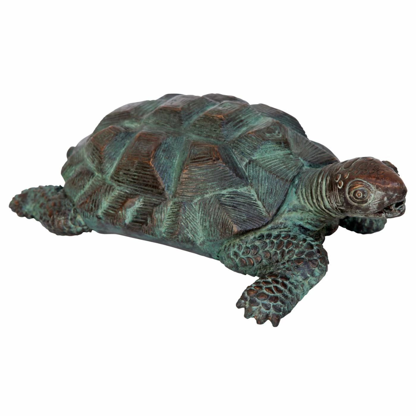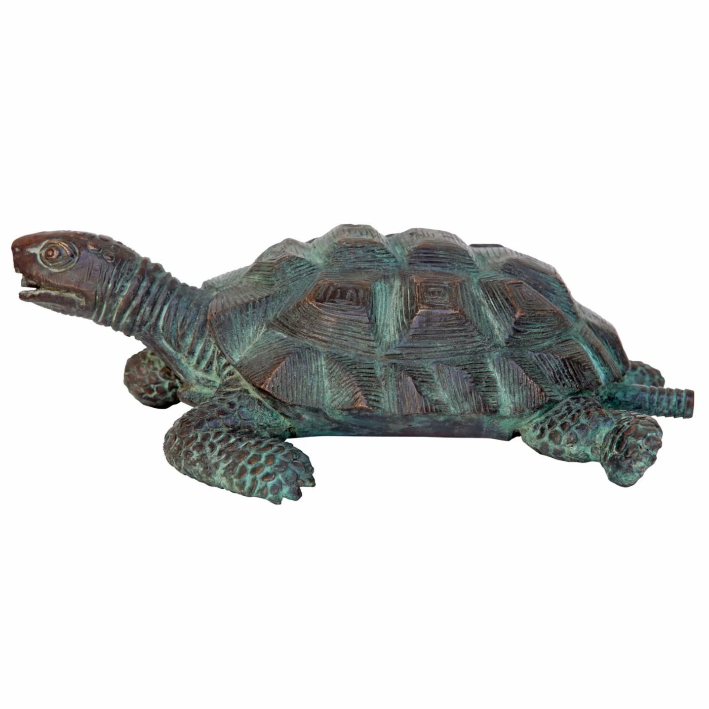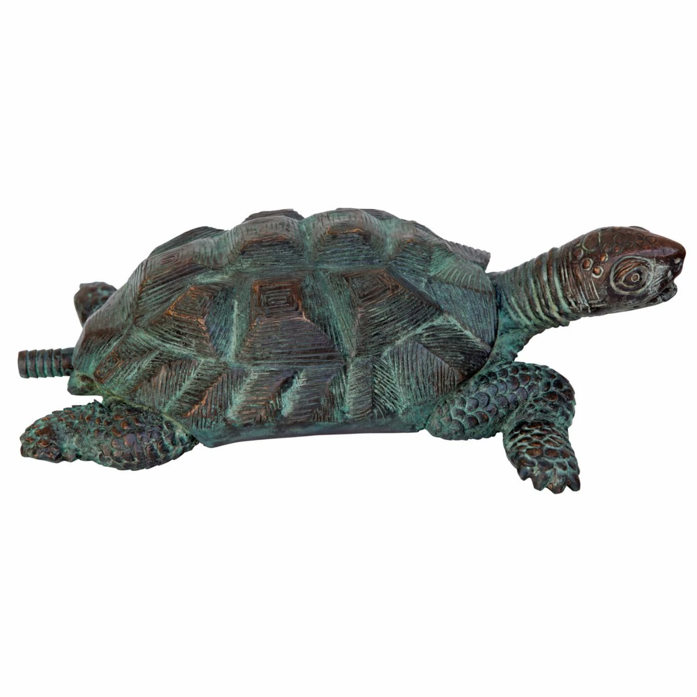 Sure to be a focal point in your garden, the Design Toscano Traipsing Turtle Garden Statue is a statue that is also piped for use as a water feature. Each turtle statue was individually cast in the traditional lost wax bronze method and sports a hand-applied emerald Verde patina that enhances each artistic detail. The turtle is piped to transform into a water feature. Simply add the optional 120 GPH pond pump kit (not included).