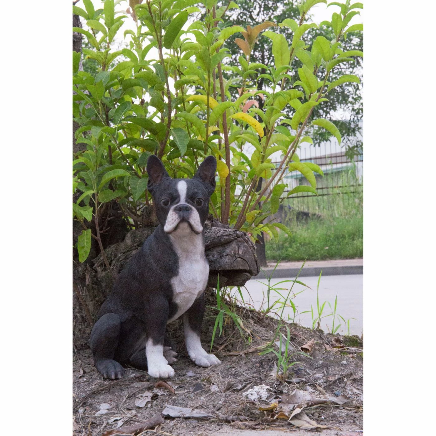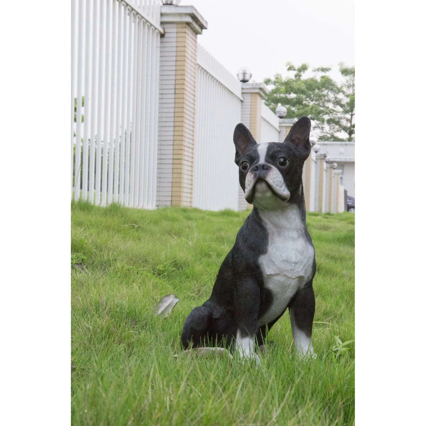 The Hi-Line Gift Ltd. Boston Terrier Dog Garden Statue is an adorable mate for inside or outside use. This pup statue is posed in an alert seated position and boasts life-like facial details.