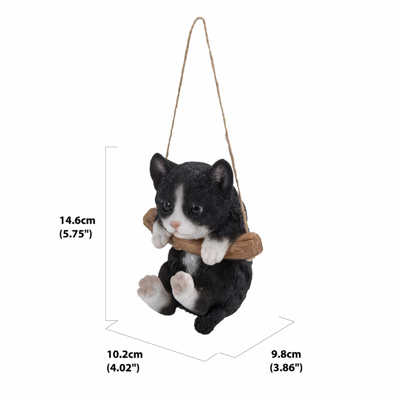 Hanging from a length of rope, the Hi-Line Gift Ltd. Hanging Black and White Kitten Statue is a fun decoration for a wall, a door, a window, or a shepherd’s hook. The cat statue is cast out of resin for resistance to wear and tear.