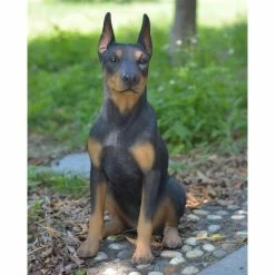 Show off your love of dogs with this polyresin Hi-Line Gift Ltd. Sitting Doberman Pinscher Dog Garden Statue, featuring perky ears and expressive eyes. A lifelike appearance shines through this Doberman Pinscher garden statue with thoughtful attention to detail, enhanced by traditional tones of black and brown.