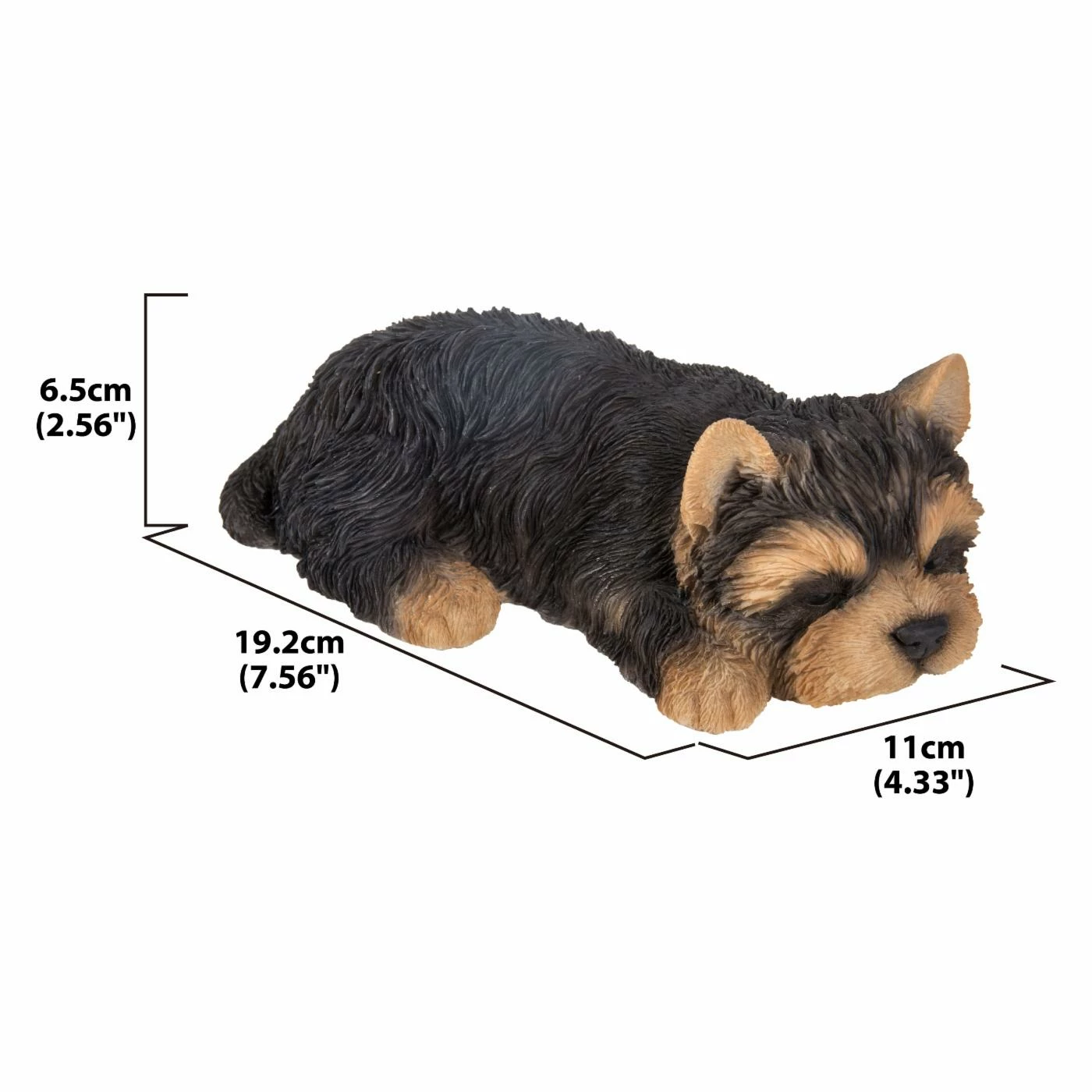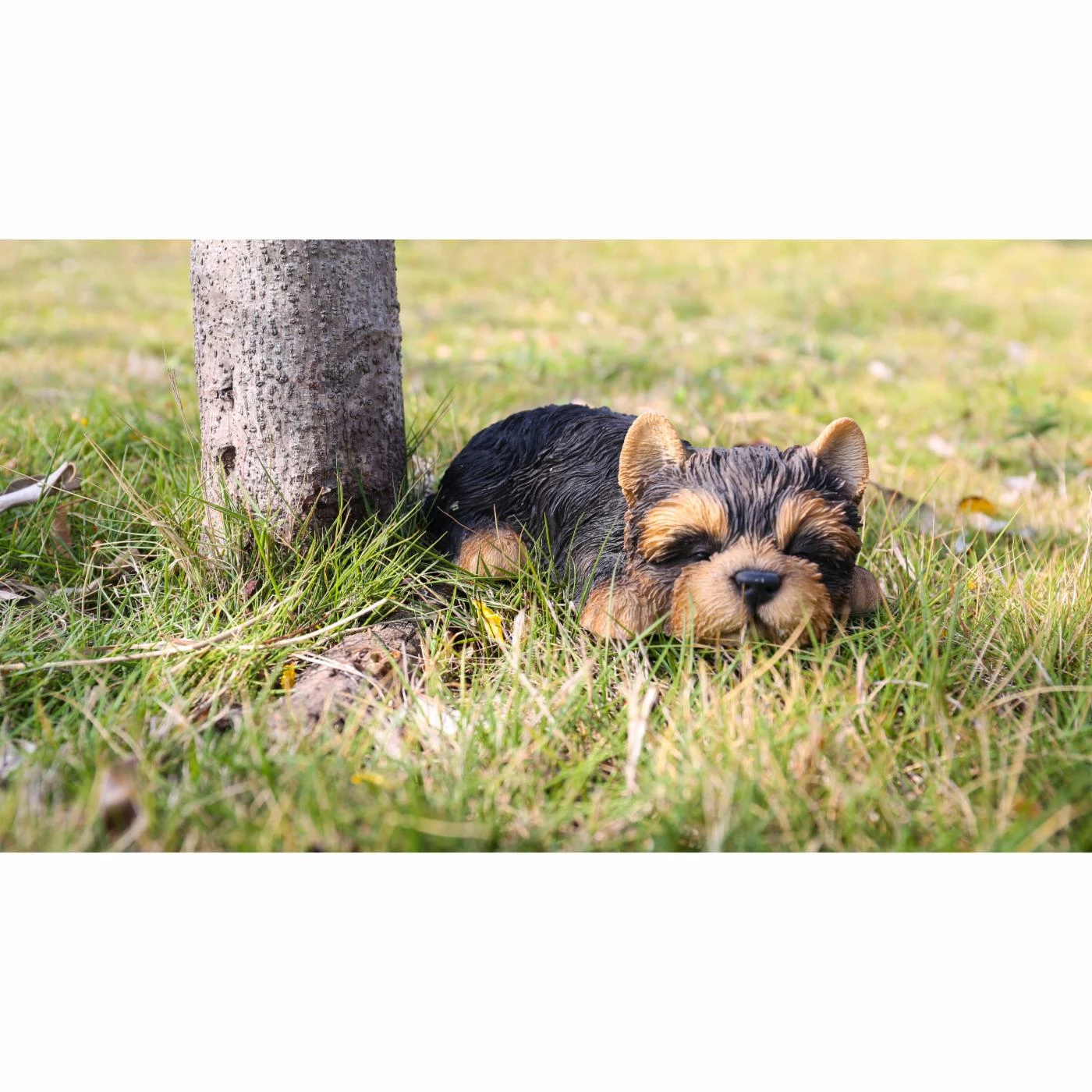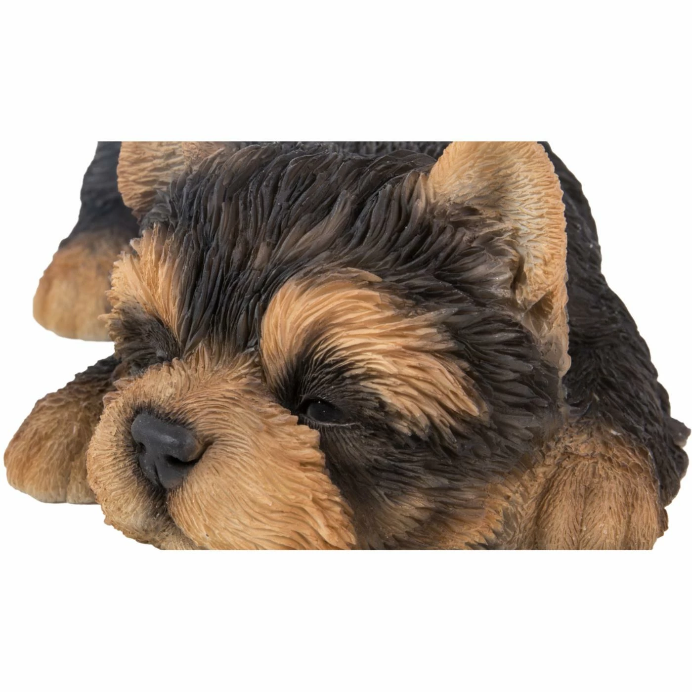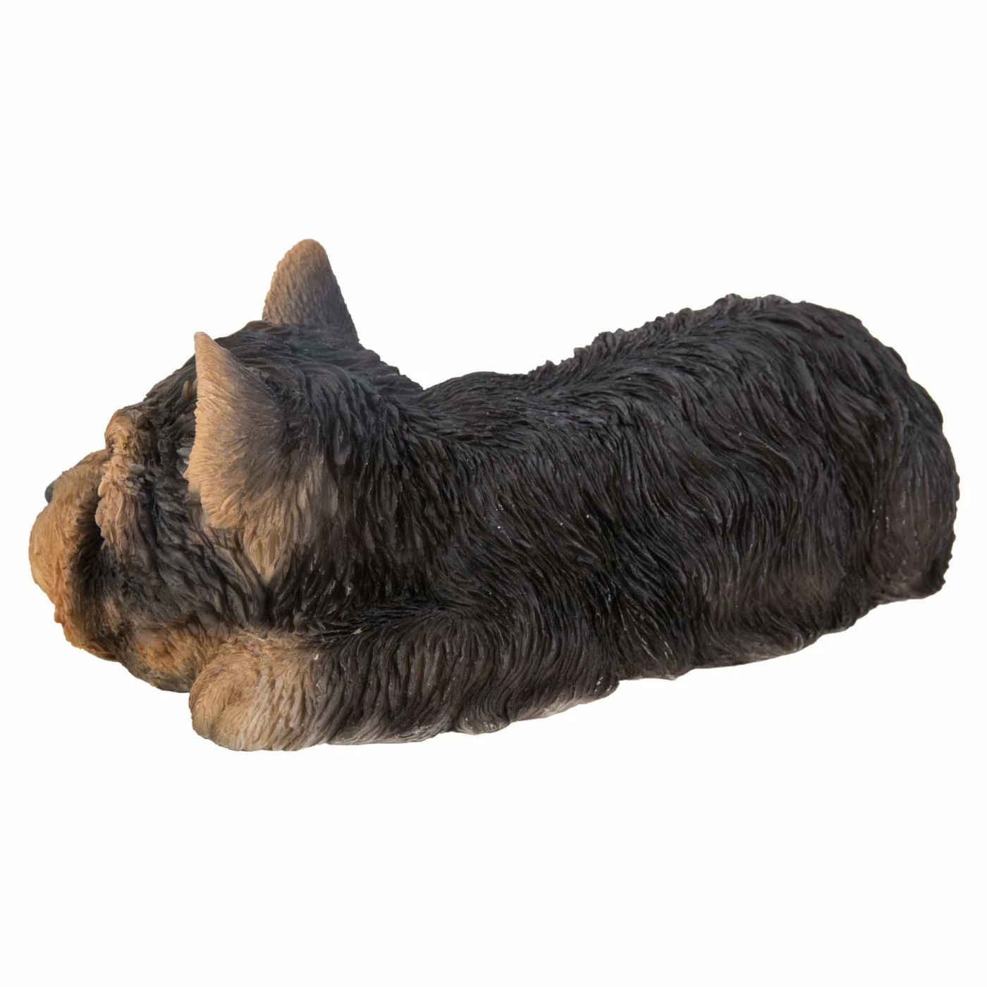 A tiny Yorkie is about to close its eyes for a nap in the design of the Hi-Line Gift Ltd. Yorkshire Terrier Puppy Sleeping. Cast out of resin and carefully painted, the sculpture is incredibly lifelike.