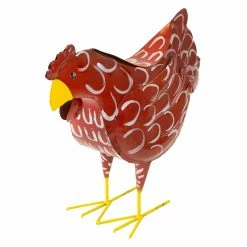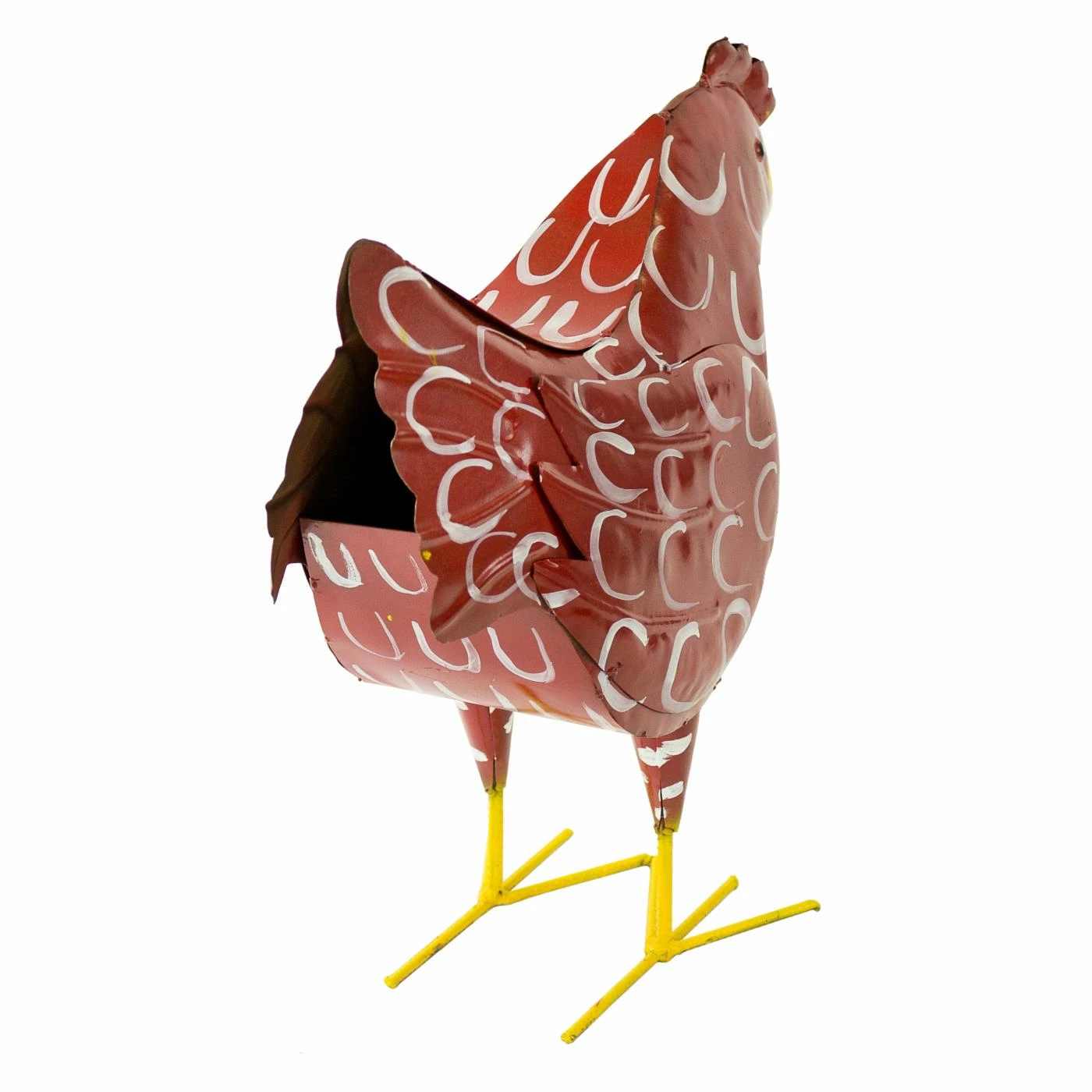 The freestanding Rustic Arrow Red Hen Medium Garden Statue may be used to add a rustic country touch indoors or out. This red hen is hand crafted by artisans using recycled materials.