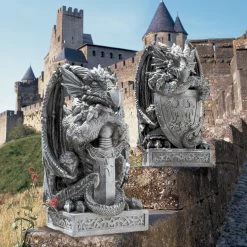 The Design Toscano The Arthurian Dragon Statue Set depicts in fantastical detail the legendary dragon brothers who loyally guard Avon Castle. Both sculptures in this set are cast in resin and feature stunning etching along the sword, shield, spiny wings, claws, and Celtic knot bases. These dragon statues are perfect for flanking your front door and are finished to resemble stone.