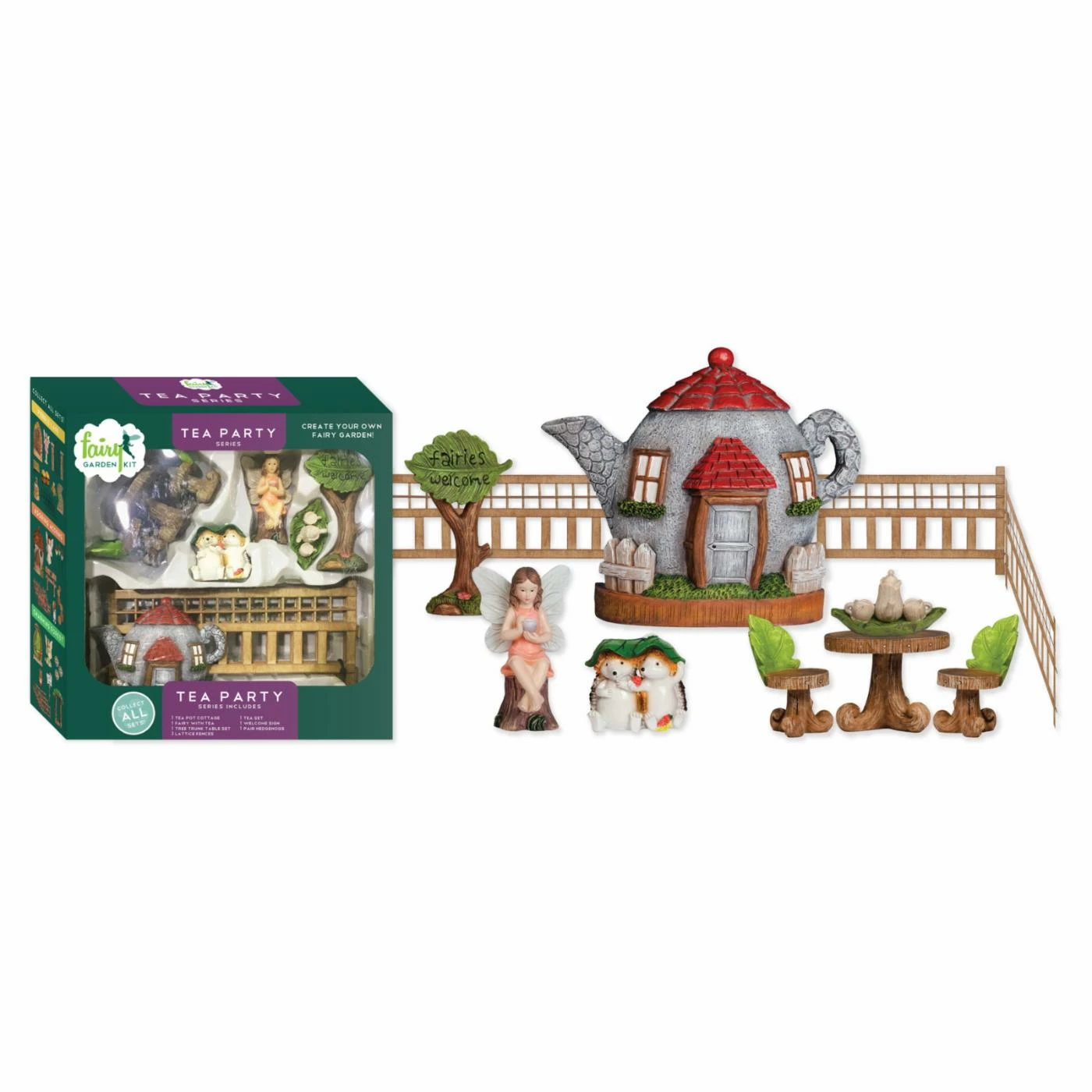 - Set includes tea pot cottage, fairy, hedgehogs, table, sign, chairs, fences
