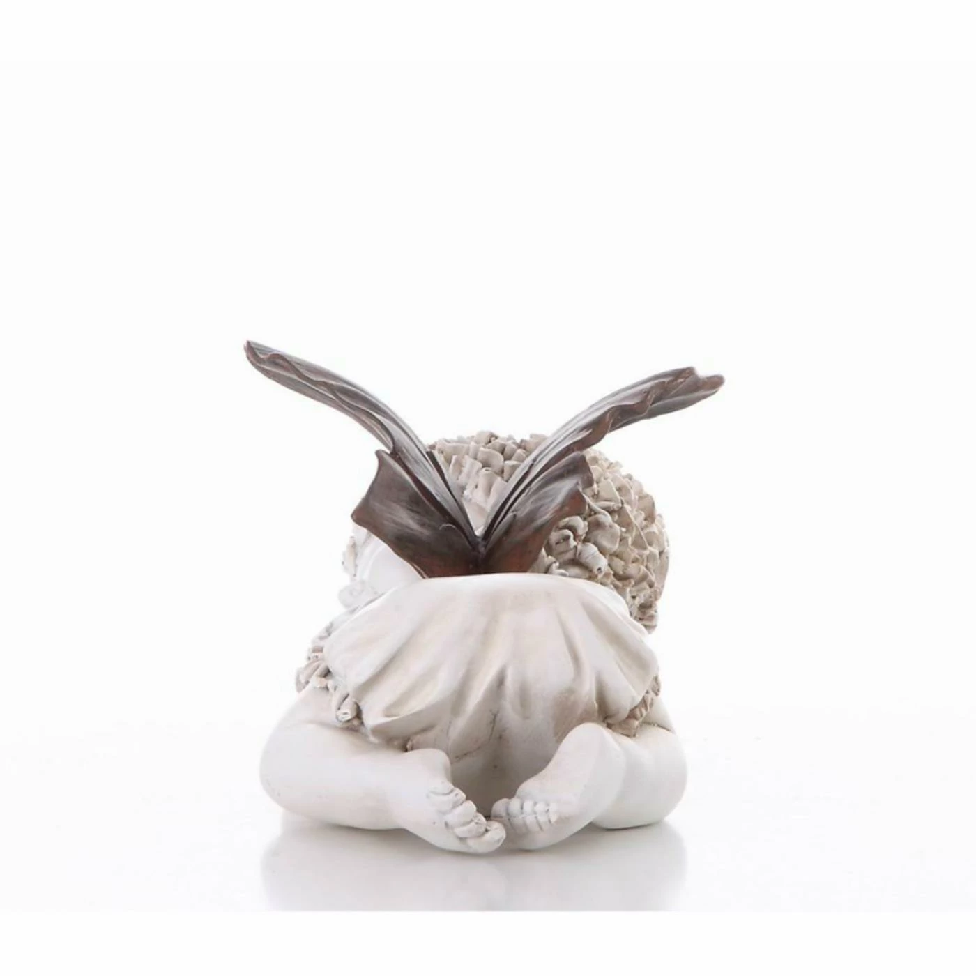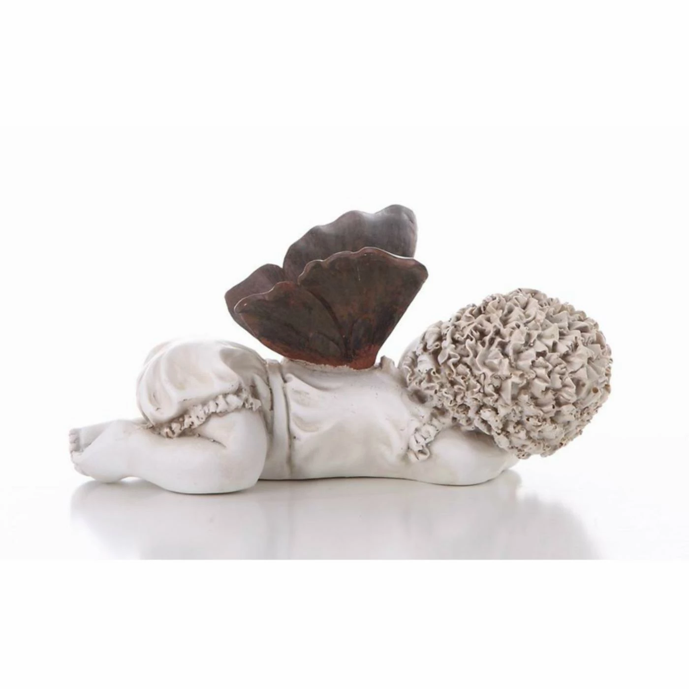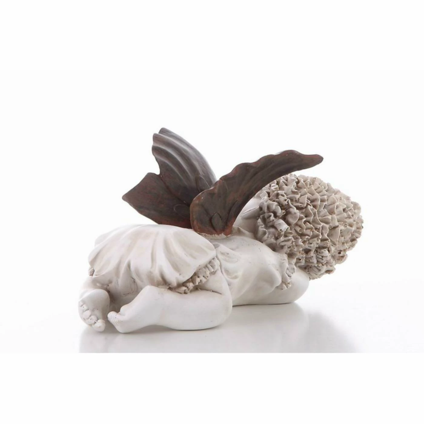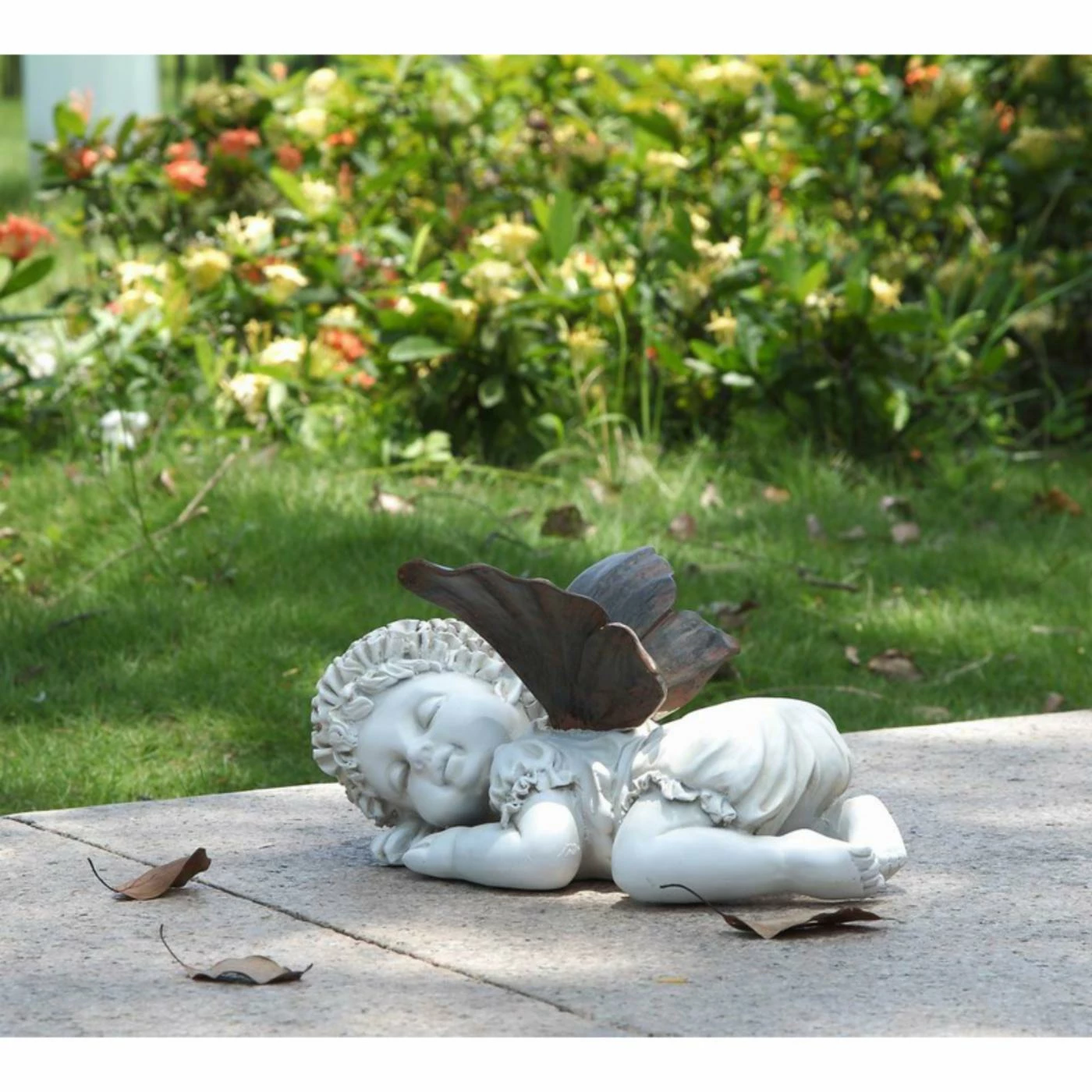 Add charm at an entrance or in the garden with the Hi-Line Gift Ltd. Sleeping Baby Fairy Garden Statue. This garden statue features a tranquil fairy that has a body cast with a creamy white finish and dark multi-tone wings, which creates an eye-catching contrast.