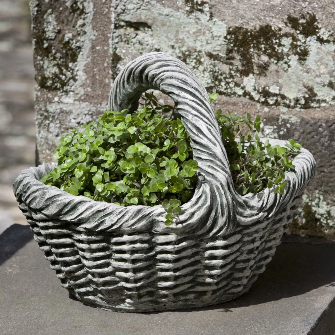 Delightful in a pair on either side of your doorway or garden gate, the Campania International Small Basket With Handle Cast Stone Garden Statue naturally takes to flowers and trailing vines. Its basket design looks realistic, yet it’s made of ultra durable cast stone. Customize this planter by choosing from available hand-applied natural pigment stain colors.