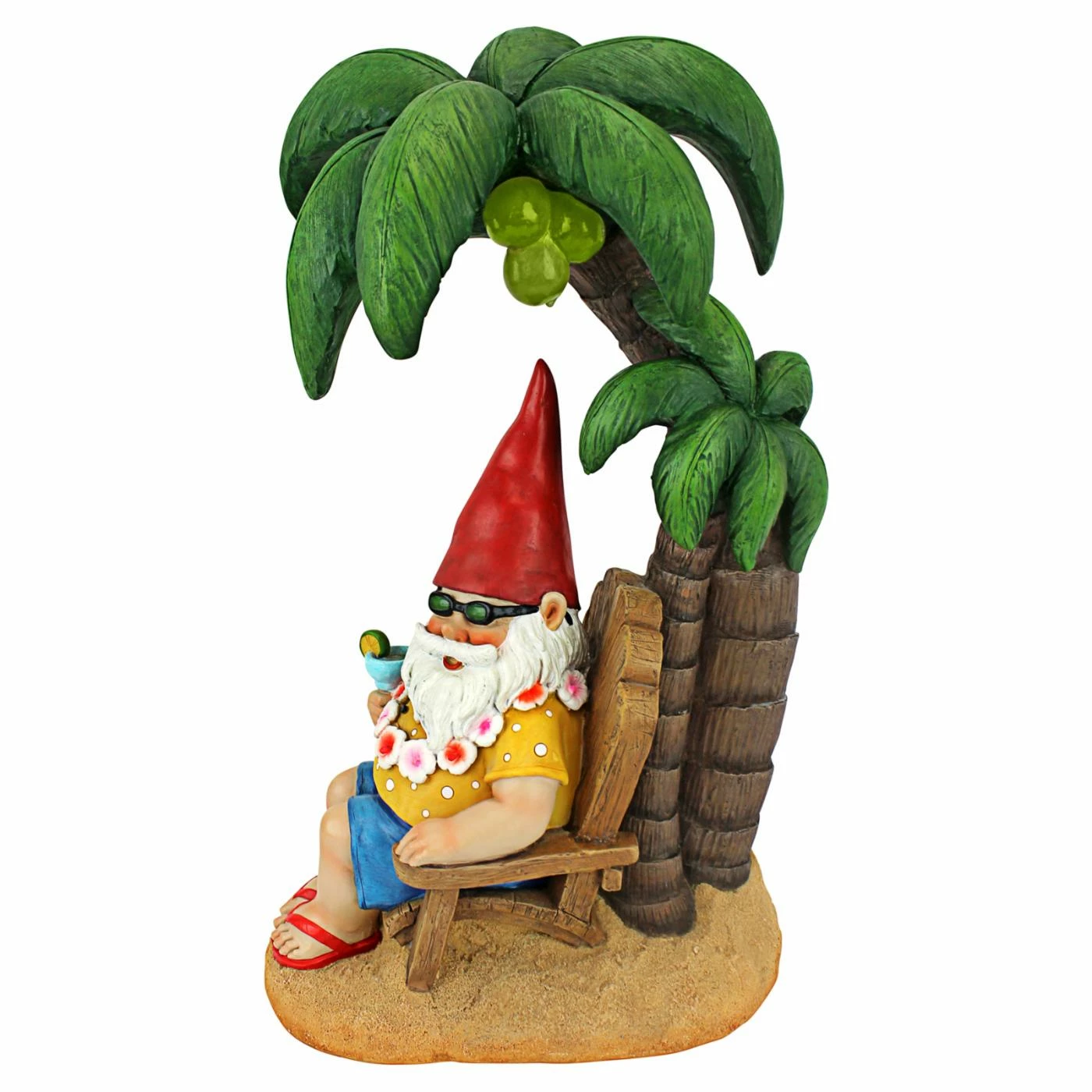 Have a bit of the tropics with you always when you display the Design Toscano Beach Gnome Garden Statue on your deck, patio, or even indoors. The charming gnome in this statue is decked out in colorful tropical garb and rests under a lush palm tree. The resin construction resists various weather conditions for lasing use.