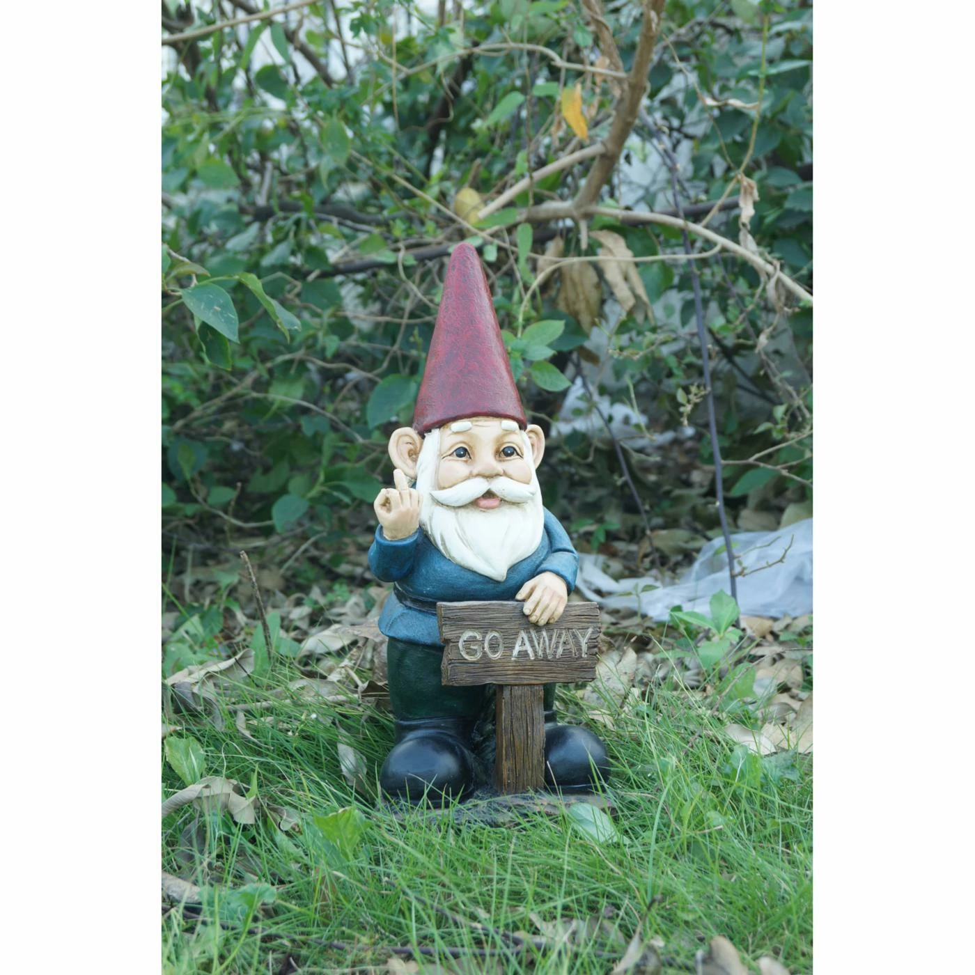 A gnome holds a playful “Go Away” sign in the Hi-Line Gift Ltd. Gnome Holding Go Away Sign Garden Statue for a fun touch to your entryway or flowerbed. This statue is crafted from durable poly-resin and features intricate detail and attractive colors. It’s a great piece for the yard, porch, or inside.