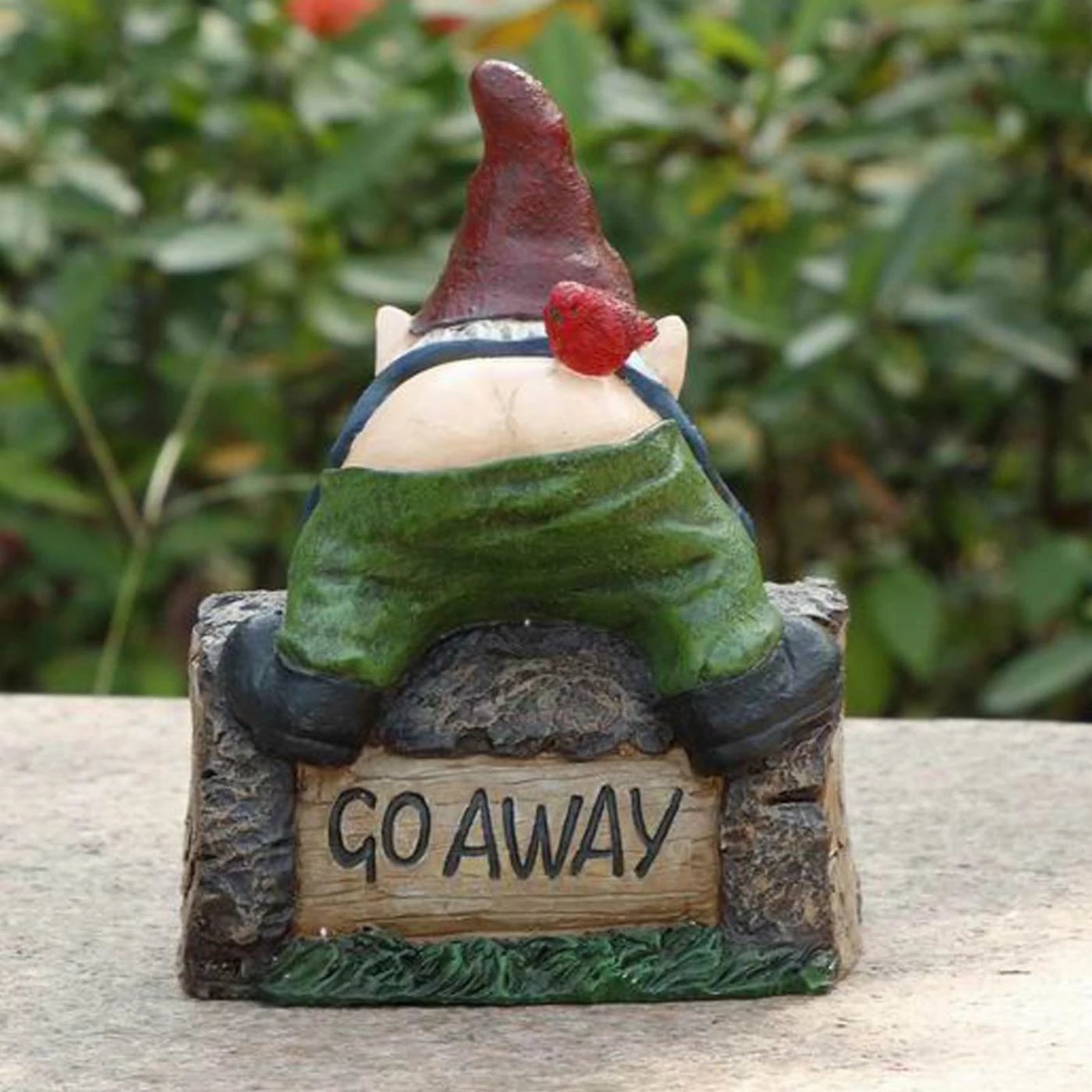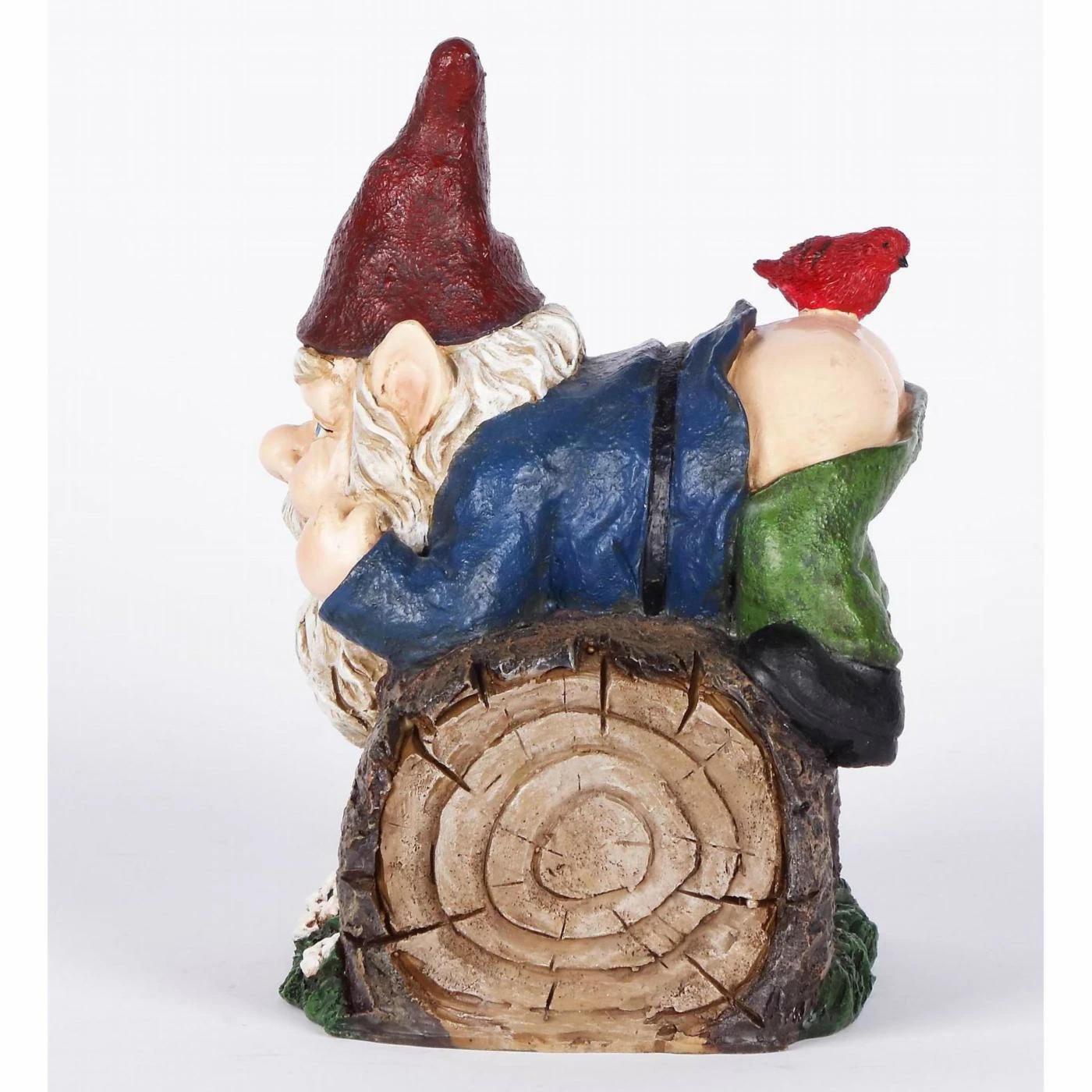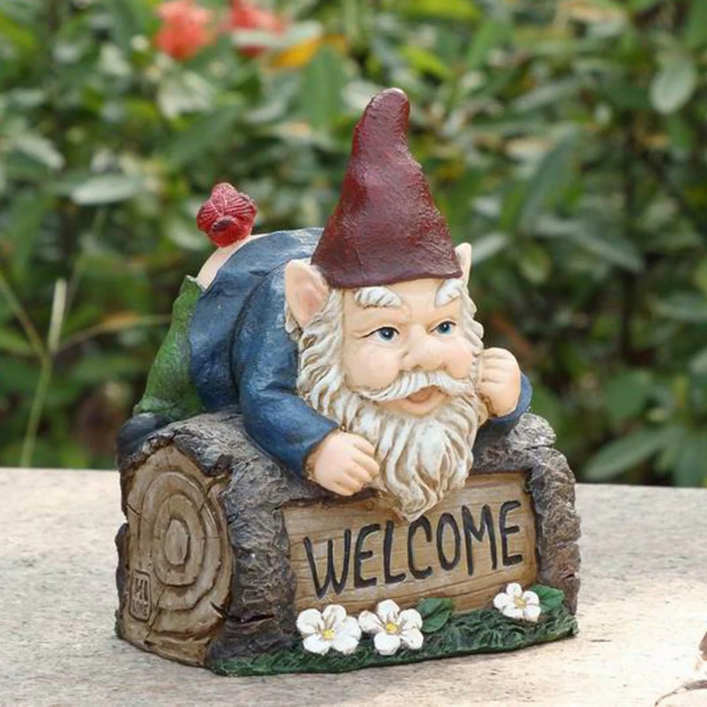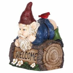 The Hi-Line Gift Ltd. Welcome Sign Gnome Crawling Over Tree Trunk offers a funny twist on the classic garden gnome. On one side, a smiling gnome greets your guests with a welcome sign; on the reverse, a sign cheekily tells guests to go away.