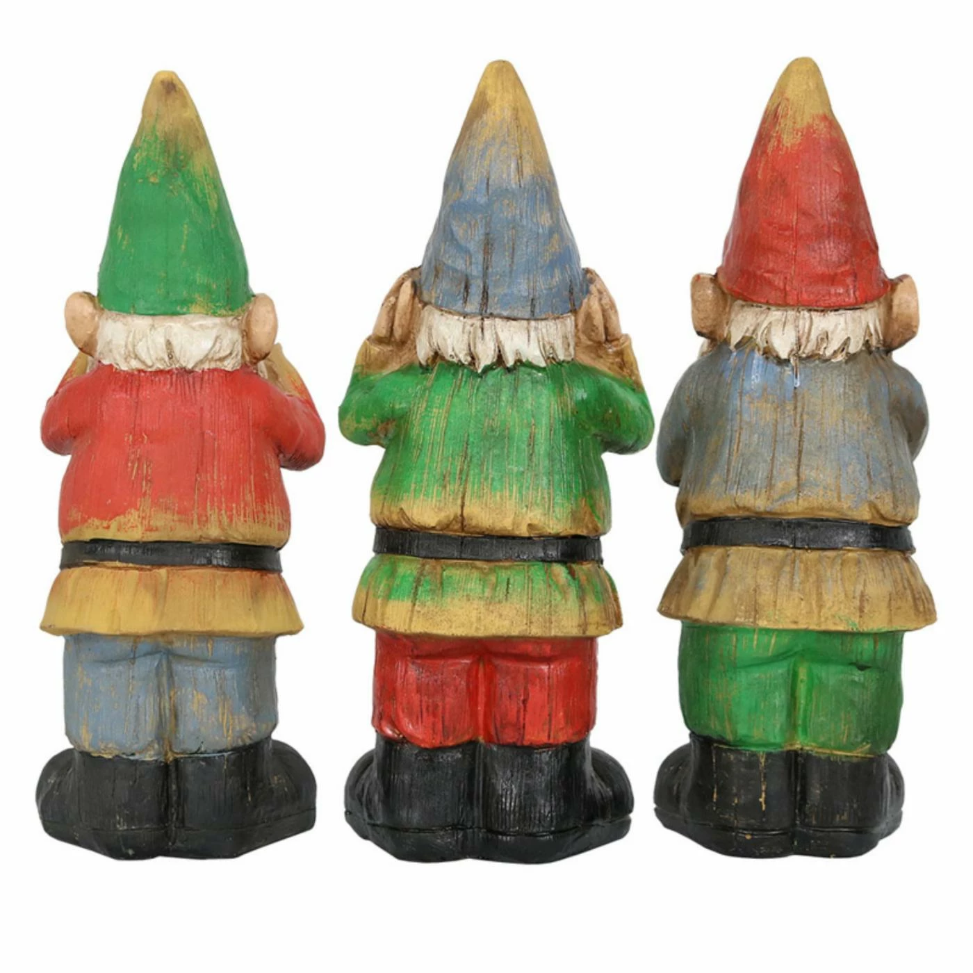 The Sunnydaze Decor Three Wise Gnomes Hear No Evil Speak No Evil See No Evil Set is made of resin and painted in a realistic, weathered finish. The set includes three garden gnomes: heart no evil, see no evil, and speak no evil.