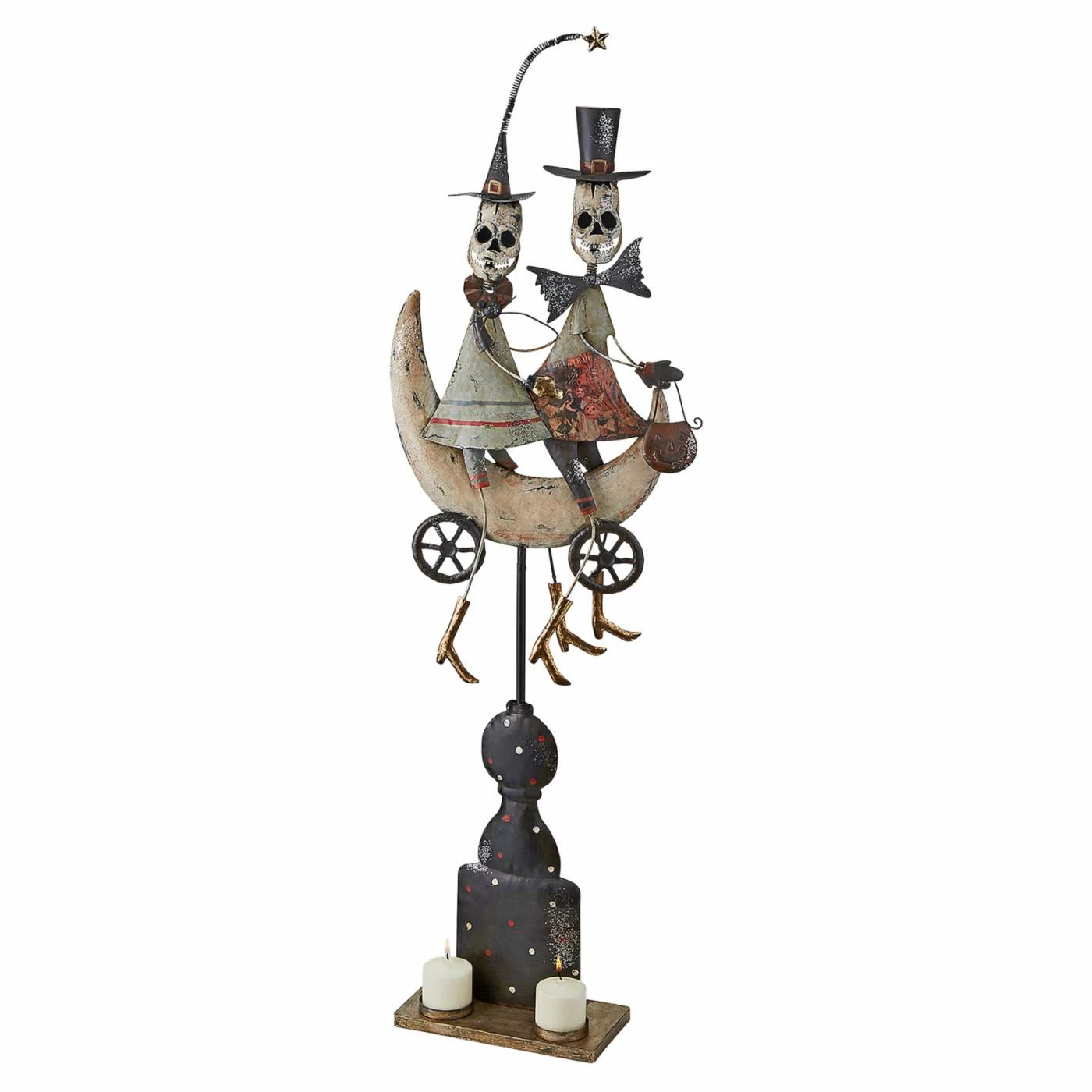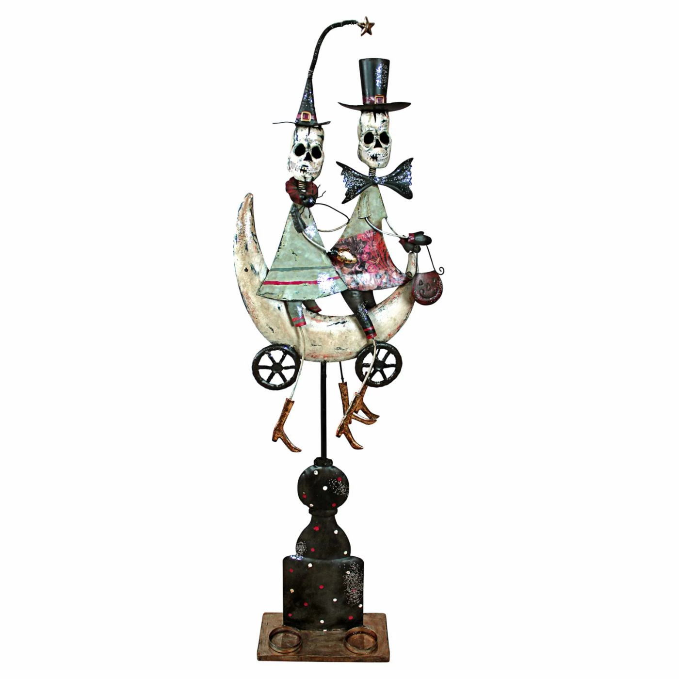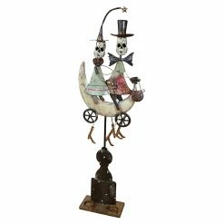 The Design Toscano Skeletons Midnight Ride Statue is perfect as part of your home’s Halloween dΓ©cor. This metal piece depicts a lively skeleton crew out for a midnight cruise on their crescent moon mobile. The heads of this statue bob on hidden springs for lively movement. Rustic finishes complete this endearing and spooking decorative piece.