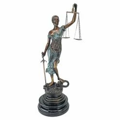 The Design Toscano Themis Blind Justice Tabletop Garden Statue makes an unforgettable gift for the attorney or judge in your life. Blindfolded Themis, Greek goddess of justice is approachable from 360 degrees, featuring an incredible level of detail on all sides. She holds scales in which to impartially weigh the evidence and a sword. Snakes of injustice cower beneath her feet. This individually cast bronze statue is made according to the traditional lost wax method. The finish is hand-applied and features two tones for additional depth and dimension; a multidimensional sepia tone bathes Themis’ smooth flesh, while her raiment is features a color-washed emerald verde patina. She stands upon a museum-mounted black marble base. The lost wax method ensures lasting beauty, making this statue an heirloom-quality work of art.